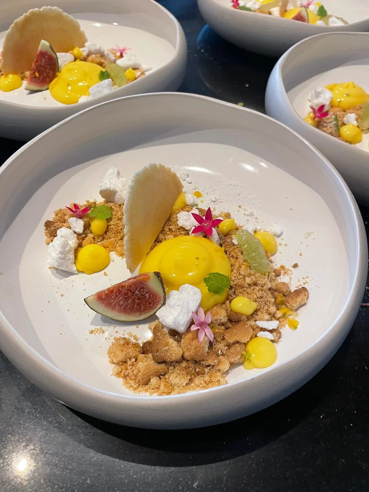 Dessert à l’assiette (ex. : pavlova exotique, tartelette citron yuzu)